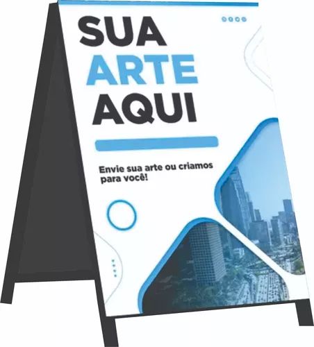Cavalete em estrutura de madeira medindo 100x60 cm, Lona impressa medindo 90x60 cm, colada e grampeada na estrutura.